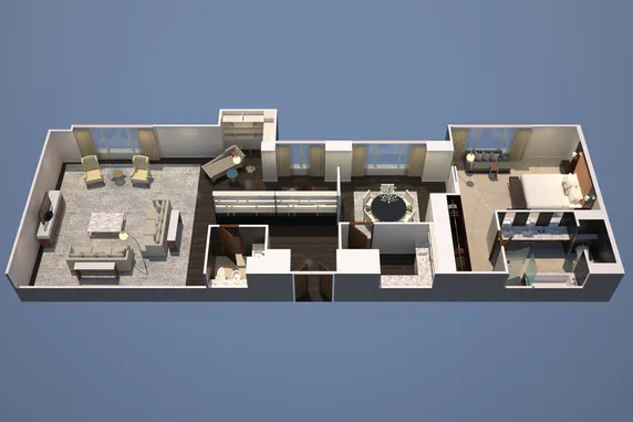 В семейном номере есть две спальни, две ванные комнаты с душем, ванной, биде. В главной спальне установлена двуспальная кровать, во второй комнате — две двуспальные кровати. В удобства включены кондиционер, телевизор, телефон, мини-бар, сейф, фен, халаты, тапочки, косметический набор.